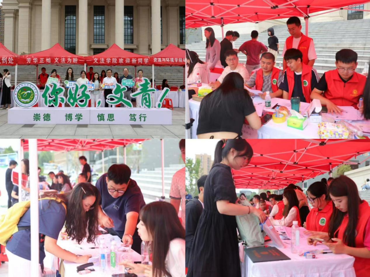 布置了温馨而充满创意的迎新现场,从欢迎横幅到指引标识,每一处细节都彰显着学院对新生的关怀,为每一名新生准备了丰富的开学大礼包,迎新志愿者们身着统一服装,以饱满的热情和耐心的态度,为新生及家长提供全方位的帮助与服务,确保每位新生都能顺利完成报到手续。此外,学院还安排了志愿者团队,他们穿梭于人群中,热心地帮助新生搬运行李、指引方向,用实际行动诠释了“以老带新,传承文法精神”的传统美德。在全院师生共同努力下,h漫