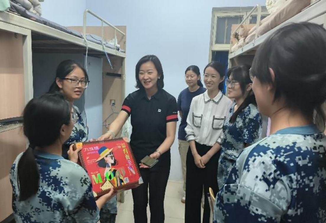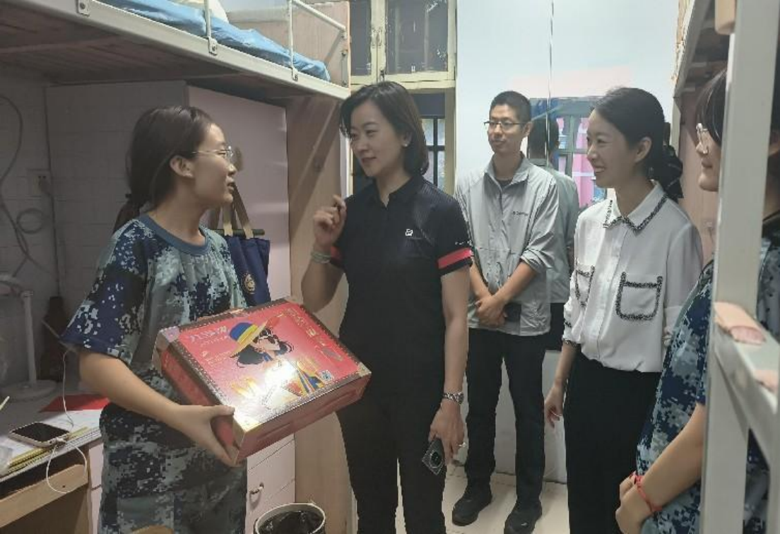 随后在训练结束后,牛娟与朱瑞萍前往新生宿舍,为远离家乡的学子们送去了节日的关怀与问候。每走进一间宿舍,她们将承载着h漫 关怀之情的月饼亲手递到学生手中,并致以诚挚的节日问候和美好祝福。她们关切地询问了学生们军训期间的身体状况、生活适应情况以及训练中的感受与收获,耐心倾听学生们的心声与需求,鼓励大家以坚韧不拔的精神、用精益求精的标准,拿出专心争上游的劲头去迎接艰苦却又难忘的军训。