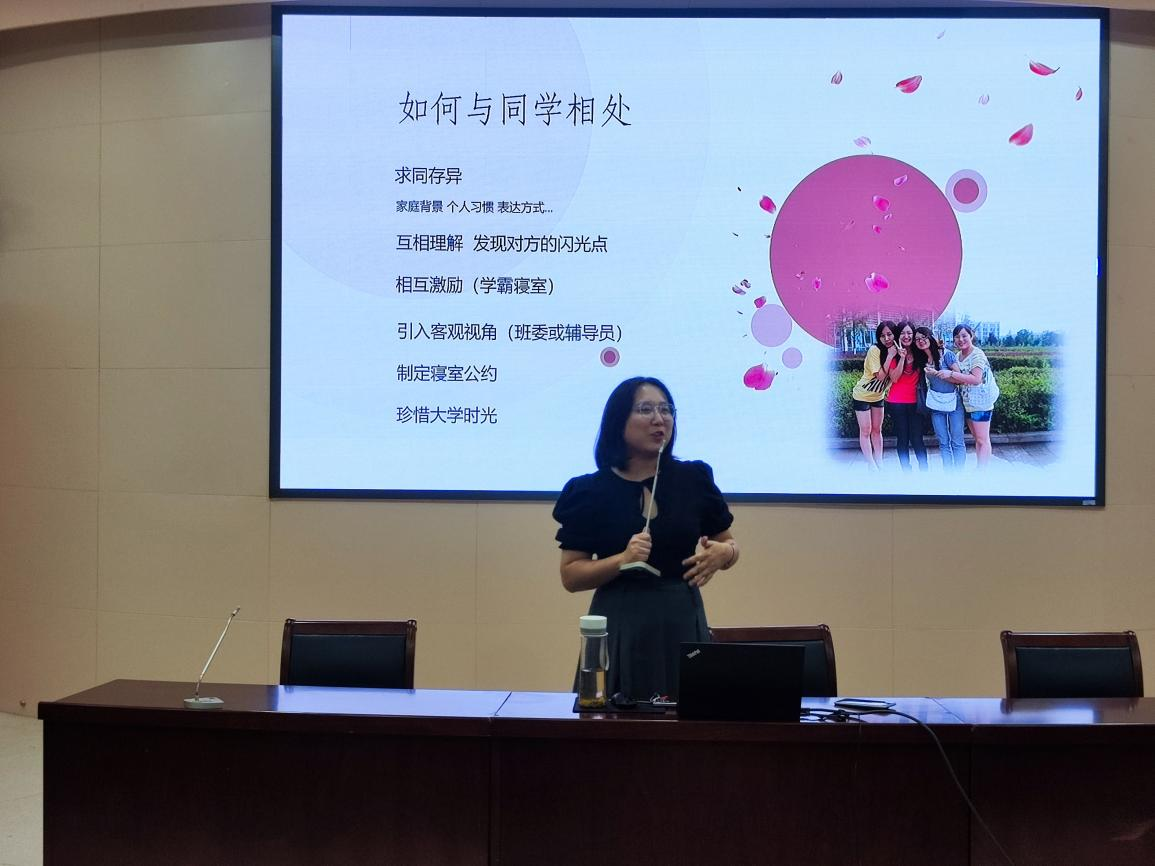 赵蕊以自身真实经历为切入点,从自我认识、人际关系、感情观三个方面入手,为学生们讲授了一堂生动有趣的心理健康教育课。首先在面对“我是谁”这个问题上,赵蕊从“如何定义自己”和“谁来定义自己”这两个方面进行阐释,鼓励新生要树立自信,精准定位未来方向,做足准备在竞争中勇于展示自我,寻求生命的价值,寻找生活的意义。其次在处理人际关系时,她表示大学是一个新的平台和新的契机,在与人相处中首先要互相尊重与支持,再者要强调自我意识,学会表达立场,向不合理大胆说“不”。最后在谈及大学生的爱情观时,她劝诫全体新生要树立健康的爱情观,在恋爱中要尊重彼此人格独立,守住爱情的底线。