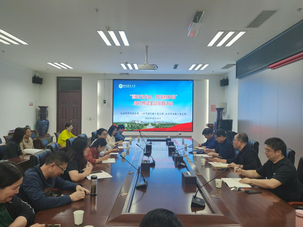 副院长李伟的带领下,社会学系教工党支部部分教师在经济与管理学院会议室与社科处党支部、工商管理系教工党支部开展“喜迎党代会、共谋新发展”结对共建主题党日活动。社科处处长李炳军、社科处副处长何泽军、经济与管理学院副院长宋宇及三个支部党员教师代表参与活动。活动由何泽军主持。