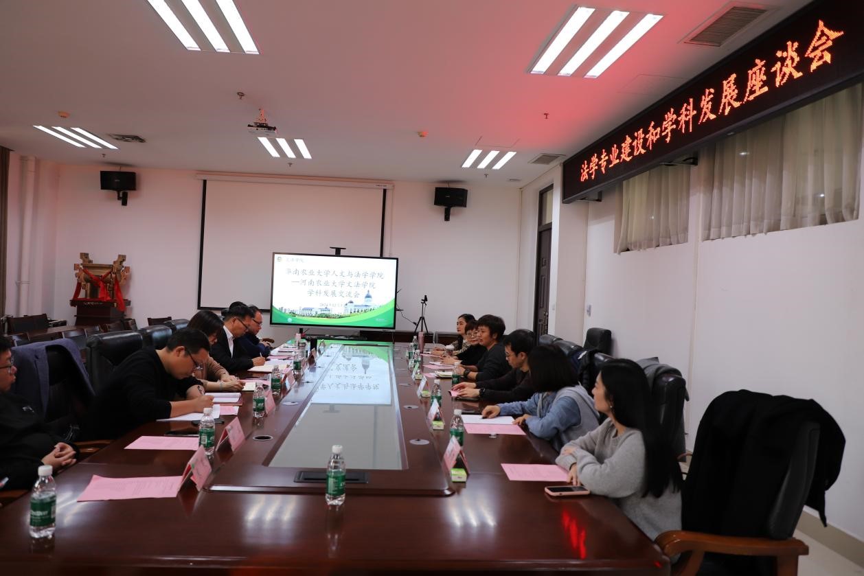 与华南农业大学人文与法学学院在学院会议室举行法学学科专业交流座谈会。院党委书记牛娟,副院长杨红朝,法律系主任韩宁,法律系教师代表,以及华南农业大学人文与法学学院法学系副主任王琳,法学系教研室主任刘万洪等参加了交流座谈会。牛娟对王琳一行的到访表示热烈欢迎,并详细介绍了我校以及h漫 的基本情况。她指出,作为同属于农业院校的两所学府,在人才培养、学科专业建设等方面,有很多可以相互借鉴和学习的地方,希望双方通过交流增进彼此了解,共同推进法学学科专业的发展。王琳对h漫 的热情接待和周到安排表示衷心的感谢,并介绍了华南农业大学人文与法学学院在法学学科建设、专业建设、人才培养等方面所取得的成就和经验。杨红朝就h漫 在法学学科建设以及研究生培养方面的现状和规划进行了详细的阐述,韩宁对h漫 法学专业建设情况进行了深入的介绍。在随后的交流环节中,双方就法学人才培养、学科建设、专业建设等议题进行了广泛而深入的讨论,分享了各自的经验和见解。