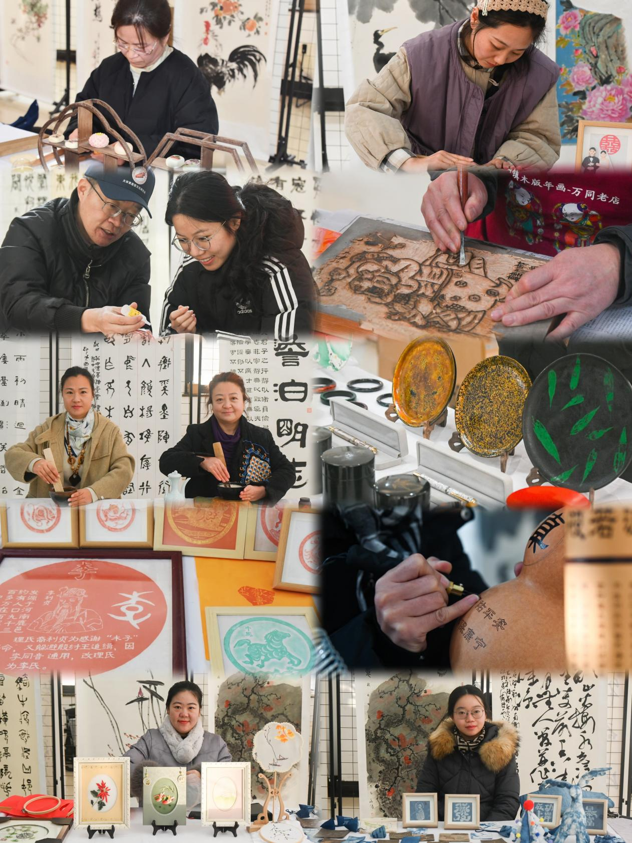 在“国风雅韵 非遗传承”艺术展中,木版年画、汴绣、金石拓片、漆艺等十大非遗项目在展区内缓缓铺陈开来,活动现场仿若一座流动的民俗博物馆。来自开封大宋黄庭坚文化研究会、山东菏泽青年美术家协会、山东水浒书画院、开封传统手工艺术制作协会的非遗传承人进行现场展示与教学。做工精细的茶果子陈列在案几,携着世代传承的匠心,成为地域文化的鲜活注脚;光影交织的灯笼高高悬挂于木柱,满是民俗古韵;雅致精妙的点茶技艺,茶香浮幽,恰似宋人雅韵重生;色彩斑斓的木版年画,承载旧岁祈愿,方寸间锁住民间烟火,代代传承......在非遗体验区,青年学生和非遗传承人近距离接触,在执笔弄墨间感受非遗文化的魅力,让古老技艺走进校园生活的日常,激发学生对传统文化的兴趣与热爱。
