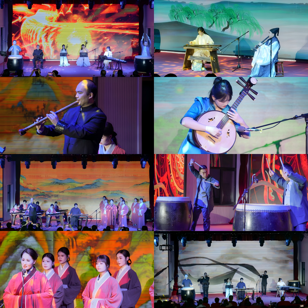 在“国风雅韵 曲韵悠扬”音乐会上,一系列经典曲目,被中国传统器乐一一奏响。民乐合奏《象王行》如同一头威风凛凛的巨兽裹挟着磅礴气势奔腾而来;琴箫合奏《长安十二时辰》恰似一把神奇的钥匙,轻轻开启通往大唐盛世的时光之门;阮独奏《火把节之夜》则似一团炽热的火焰,点燃了现场的激情;琴箫合奏《半山听雨》仿若一幅清新淡雅的山水画卷,营造了宁静致远的绝美意境;琴歌《凤求凰》宛如一段缠绵悱恻的爱情传奇,深情诉说着古典爱情的浪漫;鼓乐《牛斗》如同一记记激昂的战鼓,深深铭刻在观众的记忆深处;宋词吟唱《鹊桥仙》仿若一位温婉的佳人,将古典诗词与音乐完美融合;民乐合奏《九州同》如同一曲激昂的赞歌,众乐器齐声共鸣,如万马奔腾,气势恢宏......