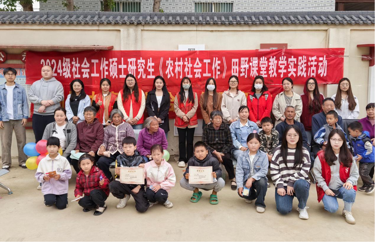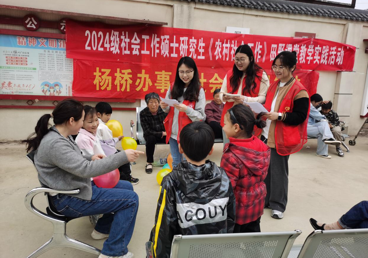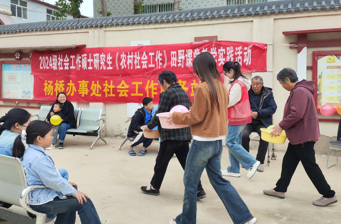 社会学系刘风主讲的《农村社会工作》课程的田野课堂如期进行。2024级社会工作硕士研究生前往郑东新区杨桥娄庄村委会开展以“亲子家庭教育之默契大挑战”为主题的田野课堂活动。此次活动通过趣味竞赛与互动游戏,聚焦亲子协作与情感表达,吸引了七对亲子家庭参与,为农村家庭教育创新实践画上圆满句号。