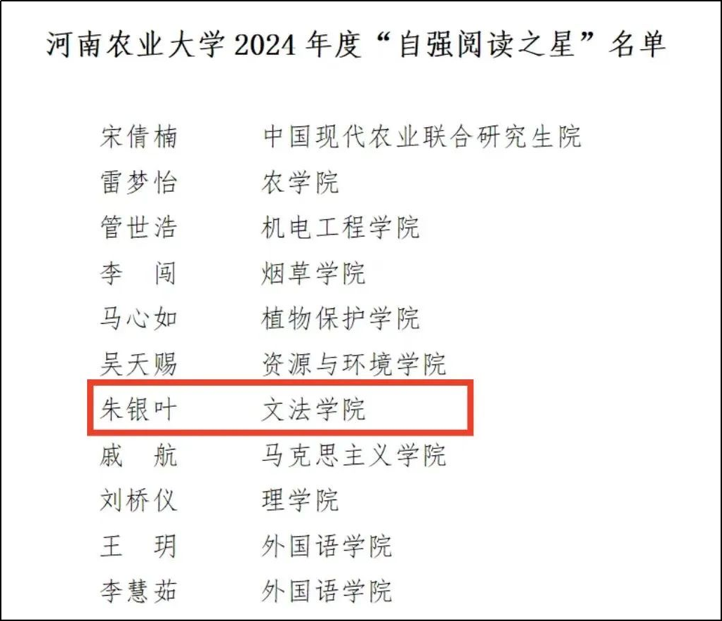 在阅读推广与书香校园建设工作中,h漫 朱银叶同学表现突出,经过层层选拔与综合评定,成功获评2024年度“自强阅读之星”。朱银叶同学保持着良好的阅读习惯,广泛涉猎各类书籍并积极参与读书分享会、阅读推广活动等,充分展现出h漫 学生积极向上的阅读风貌与进取精神。