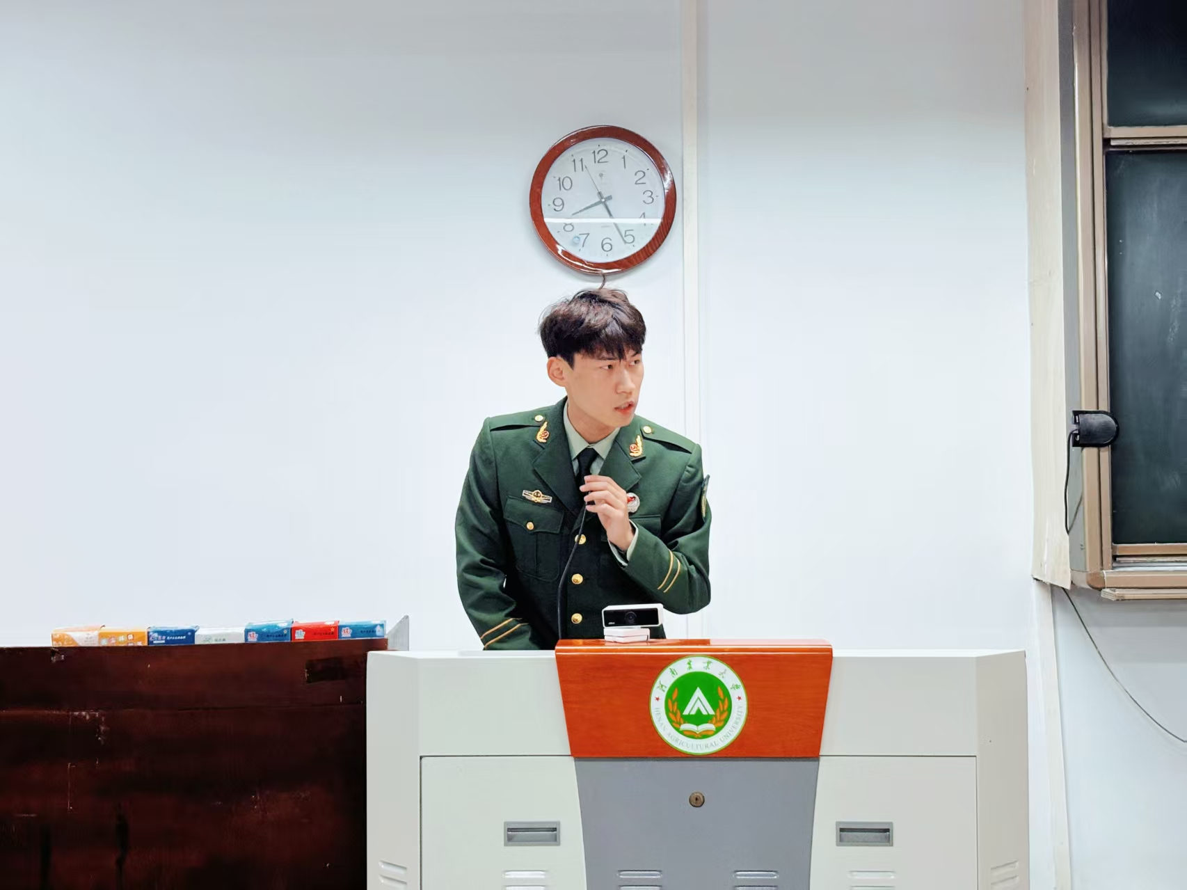 于桃李园学生公寓桃西楼204教室举办国旗护卫队与农大铁军招新宣讲活动。活动由2025级新生辅导员赵梦闪主持,国旗护卫队队员焦岚颖、退役大学生士兵暨农大铁军成员石家瑜、方威、王冉冉主讲,h漫