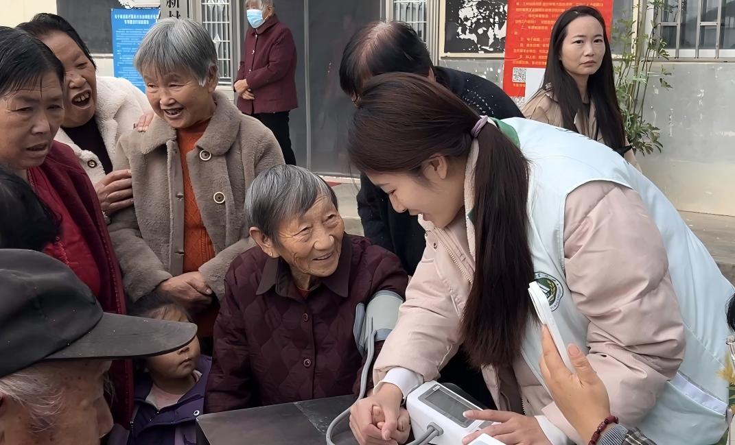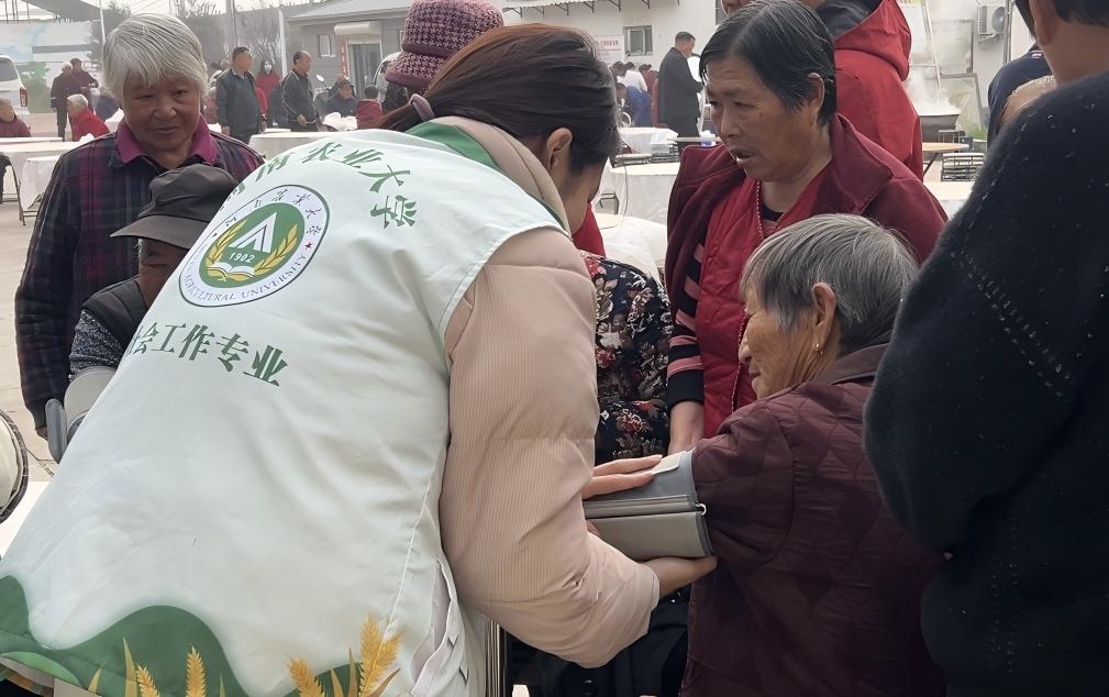 活动当天,h漫 研究生团队结合社会工作专业优势,提前协助村委进行活动策划与现场布置,确保活动流程有序进行。活动伊始,h漫 两位研究生为到场的老年人测量血压、记录健康数据,并运用所学的健康社会工作知识向老人们讲解慢性病预防与日常健康管理要点,耐心解答老人们在生活中遇到的健康困惑。同时,研究生们还与村干部共同参与“好婆婆奖”“好媳妇奖”的颁发环节,用专业视角观察并总结社区长者间的家庭互助与情感支持,为后续社区和谐建设提供实践经验。