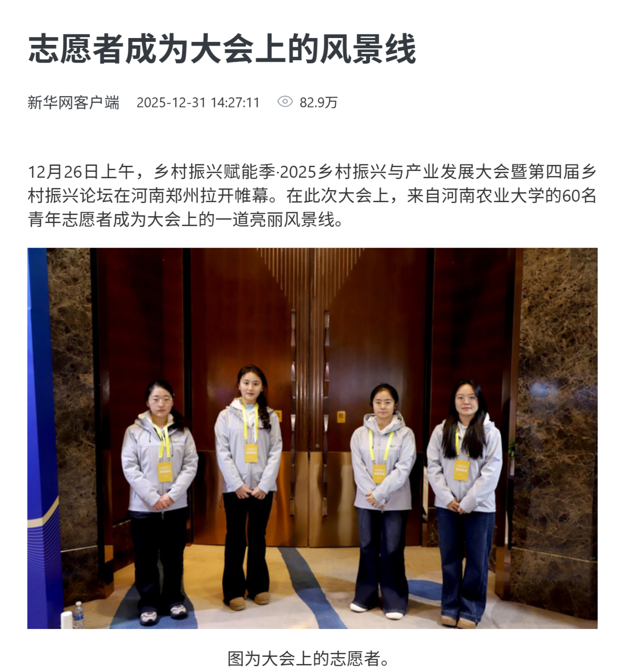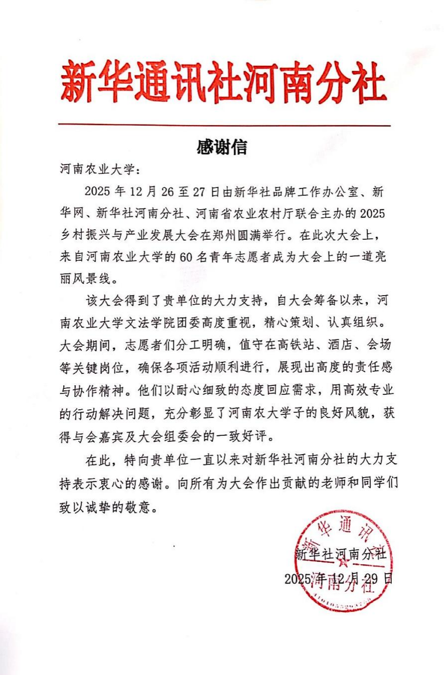 本网讯(通讯员 王晓彤)近日,新华通讯社河南分社向我校发来感谢信,信中对我校在2025乡村振兴与产业发展大会中提供的志愿服务支持表达了诚挚谢意,尤其对h漫