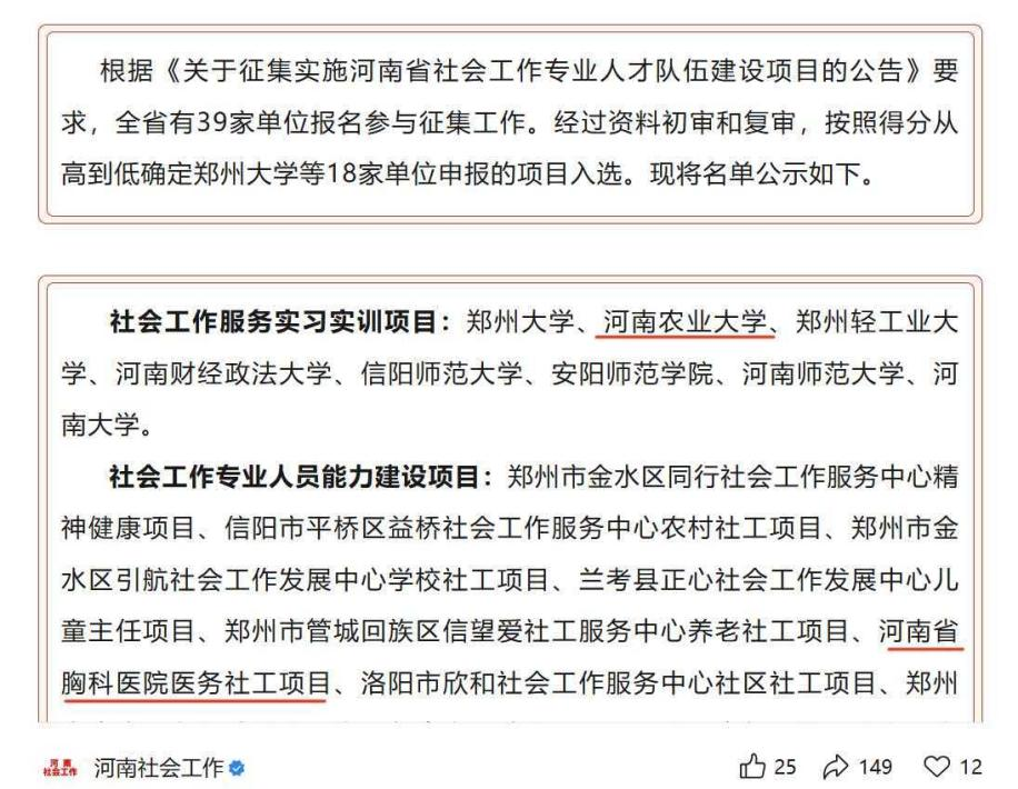 本网讯(通讯员 谢娅婷)近日,河南省社会工作专业人才队伍建设项目征集名单公示,我校牵头的《校医地协同育人机制下的医务社工助力乡村健康治理实习实训》项目获得社会工作服务实习实训项目支持,我校协同河南省胸科医院申报的《“医路相伴”医务社工能力建设》项目获社会工作专业人员能力建设项目支持。两个项目均依托我校与河南省胸科医院共建的社会工作专业研究生联合培养基地培育建设,既是h漫