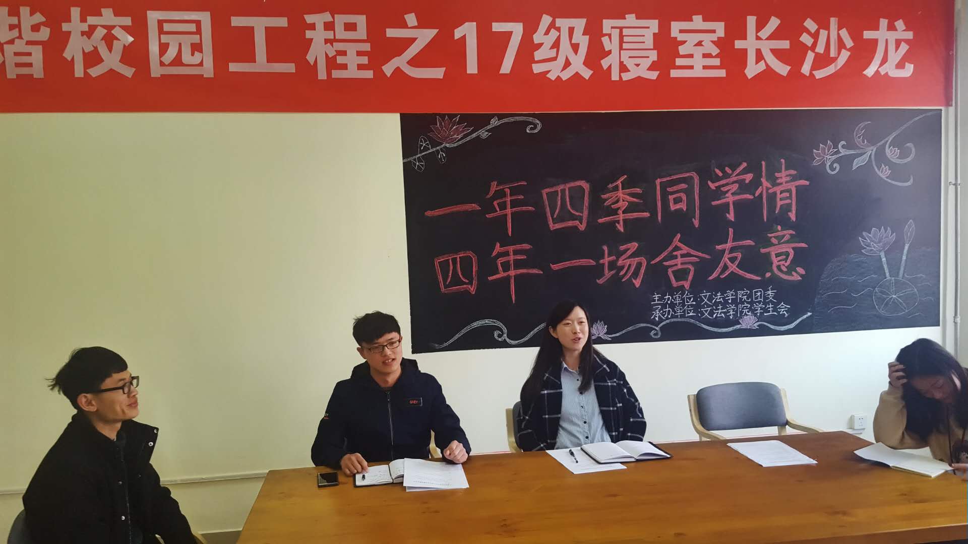 于紫竹304 举办以“一年四季同学情,四年一场舍友义”为主题的和谐校园工程之寝室长沙龙会议。此次活动由17级辅导员朱瑞萍主持,17级全体寝室长和学生会相关部门学生参加。