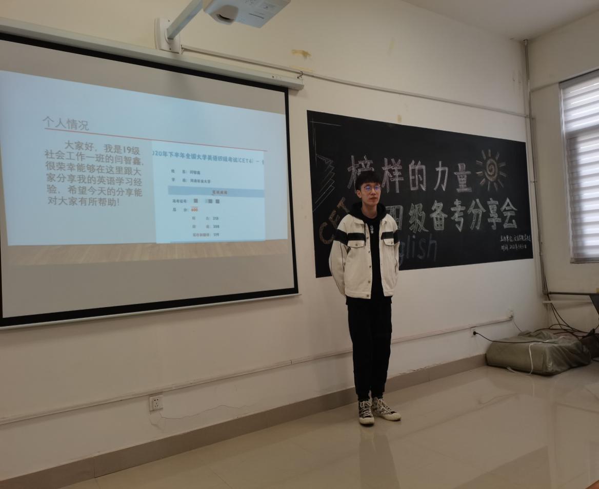 2021年3月30日下午,学生会学实部邀请19级社会工作一班闫智鑫、19级法学二班黄海瑞两名四六级高分学生,在紫竹303举行了大学英语四级交流分享会,学院部分学生参与此次活动。