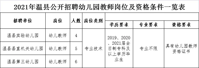 4、符合招聘岗位的年龄、学历、专业等资格条件(详见附件1:《2021年温县公开招聘幼儿园教师岗位及资格条件一览表》)。2017年起招生的非全日制研究生与全日制研究生学历学位具有相同效力;
