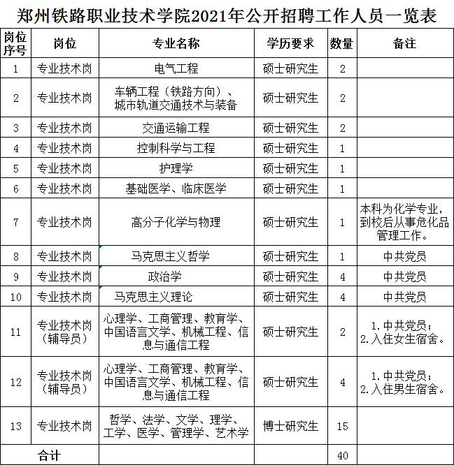 7.岗位所需的专业和其他条件详见《郑州铁路职业技术学院2021年公开招聘工作人员一览表》。