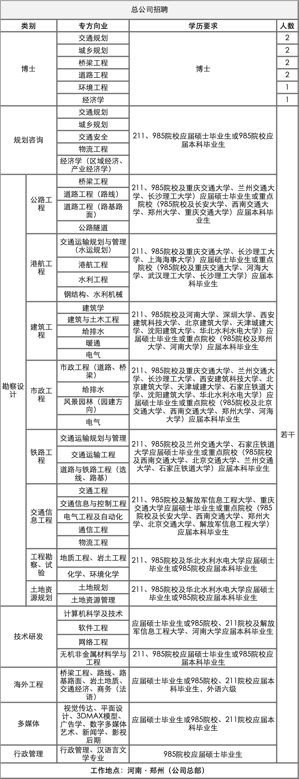 根据公司未来战略规划安排,并结合业务快速发展的需要,公司需广纳贤才,吸纳更多的优秀学子加入到我们的团队,一同服务于我国交通建设行业。现发布2022年度应届毕业生招聘公告,具体招聘岗位如下: