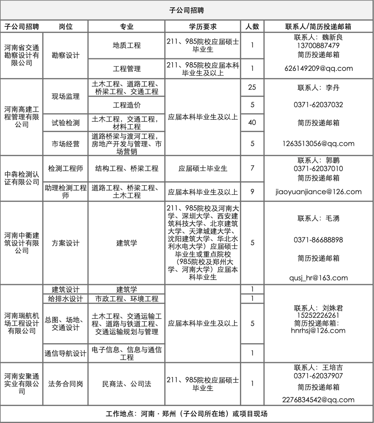 公司具有协作创新的团队工作氛围、以人为本的员工教育培训机制、科学现代的薪酬福利体系,校园招聘员工享受基础薪酬、试用期津贴(入职一年内)、绩效薪酬、社保费用、职工体检、节日问候等福利待遇,是全河南省交通行业的人才高地,更是优秀学子干事创业的良好平台。
