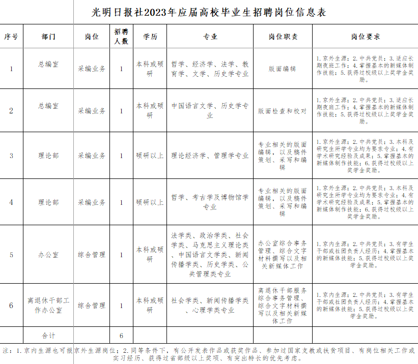 本次计划招聘6人,具体岗位及资格条件详见《光明日报社2023年应届高校毕业生招聘岗位信息表》。其中,有关岗位专业条件参考教育部公布的专业目录(《普通高等学校本科专业目录》和《授予博士、硕士学位和培养研究生的学科、专业目录》)。报名应聘人员在报名时对专业有任何疑问的,可以直接拨打报名咨询电话进行咨询了解。